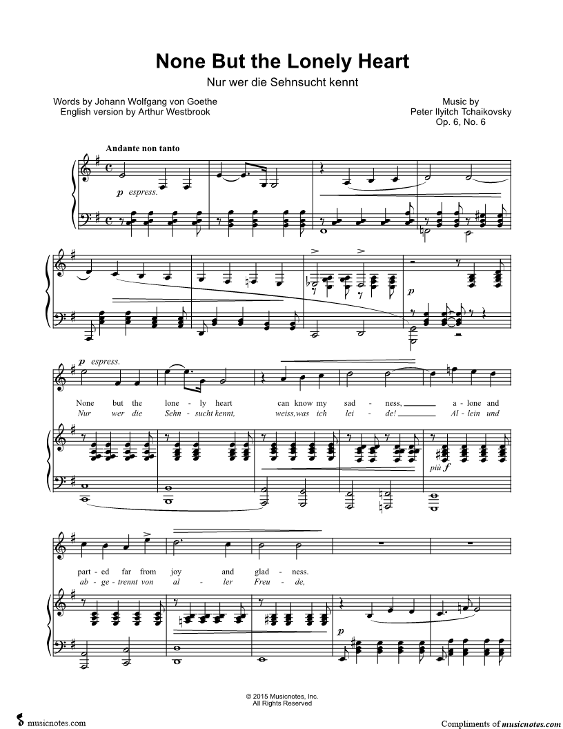 None but the lonely heart can know my sadness, alone and parted far from joy and gladness. |