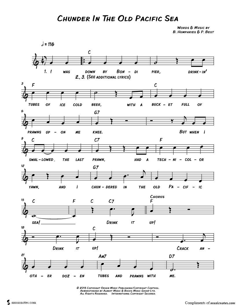 I was down by Bondi pier, drinkin' tubes of ice cold beer, with a bucket full of prawns upon me knee. |