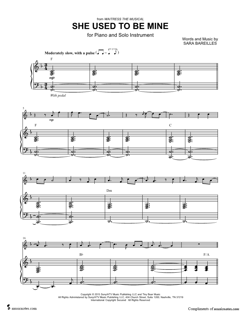 She Used to Be Mine - Bass Clef Instrument & Piano