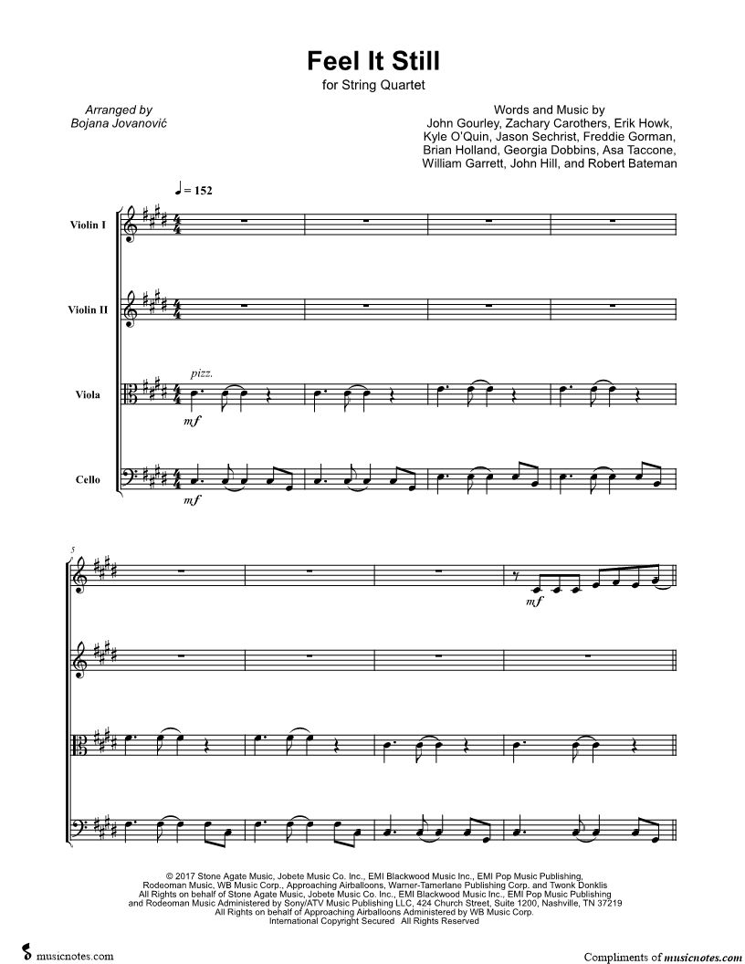 Violin 1, range: B3-C#6 Violin 2, range: G#3-E5 Viola, range: E3-C#5 Cello, range: C#2-F#3 | |