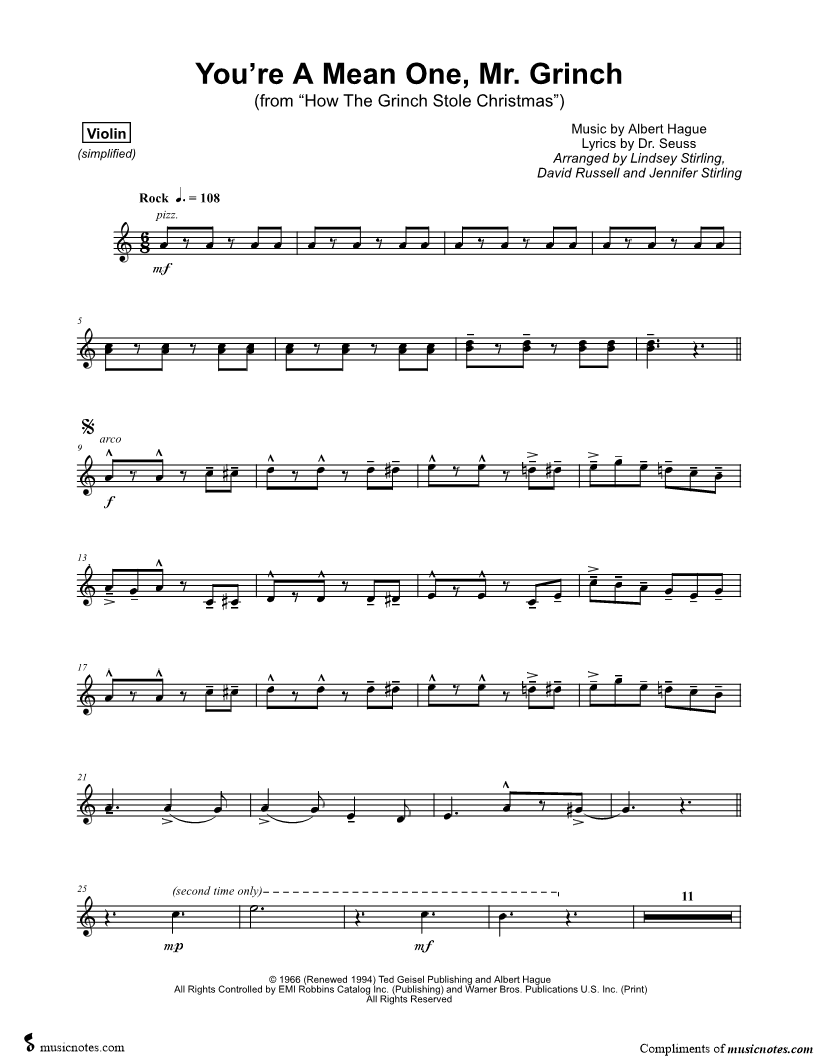 You're a Mean One, Mr. Grinch - Violin & Voice [simplified] |