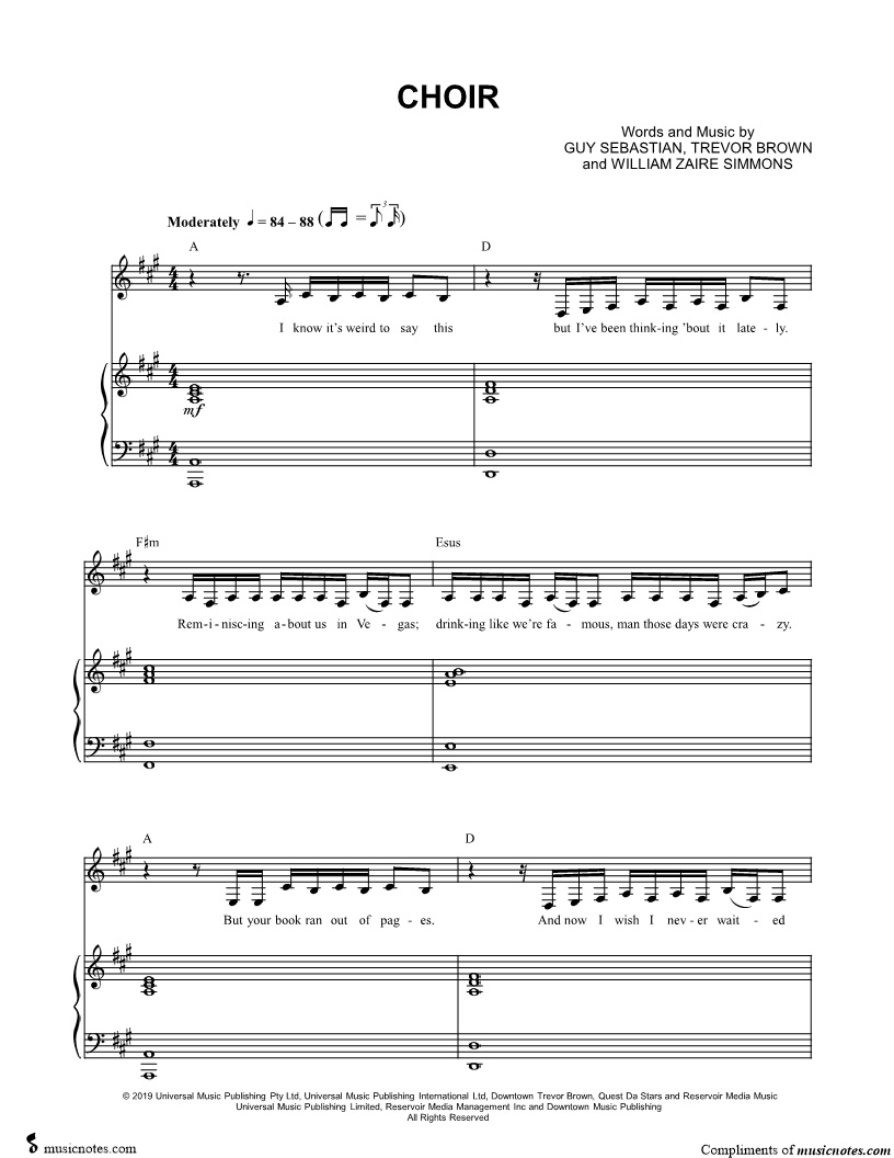 Musicnotes sells a wide variety of digital sheet music products including Singer Pros, Beginner Notes, Choral music, Piano Solos, Lead Sheets, Piano/Vocal/Guitar, Solo and Accompaniment, and fretted instrument tablature.