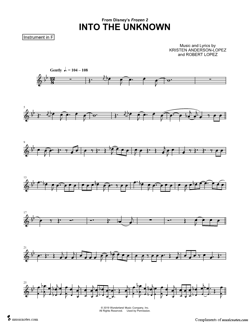 Into the Unknown - F Instrument & Piano (from Disney's Frozen 2)