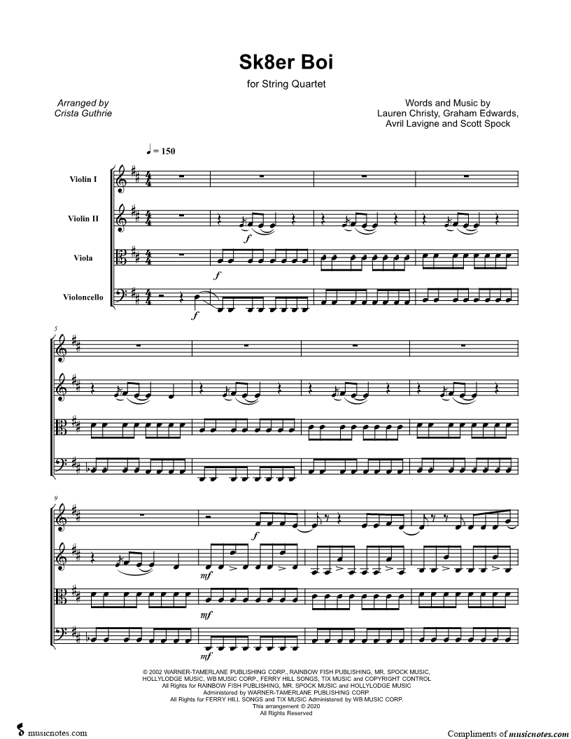 Violin 1, range: A3-Bb5 Violin 2, range: A3-A5 Viola, range: C3-Bb4 Cello, range: D2-Bb3 | |