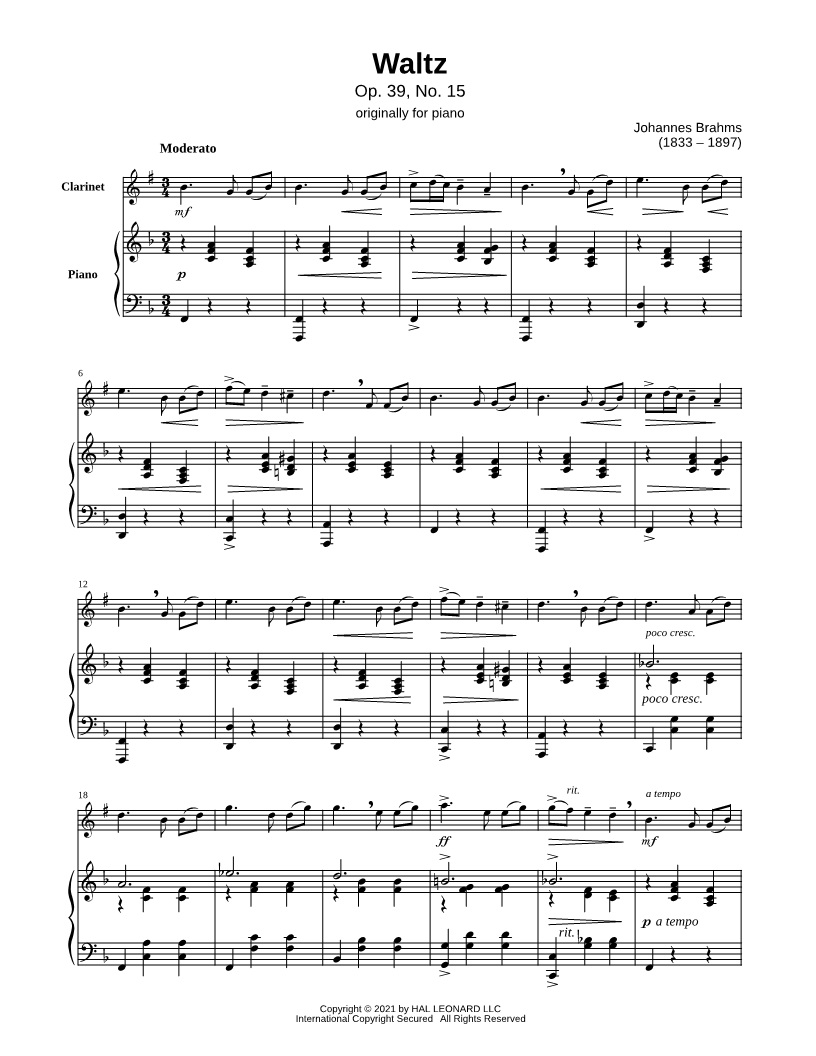 Waltz, Op. 39, No. 15 - Clarinet & Piano |