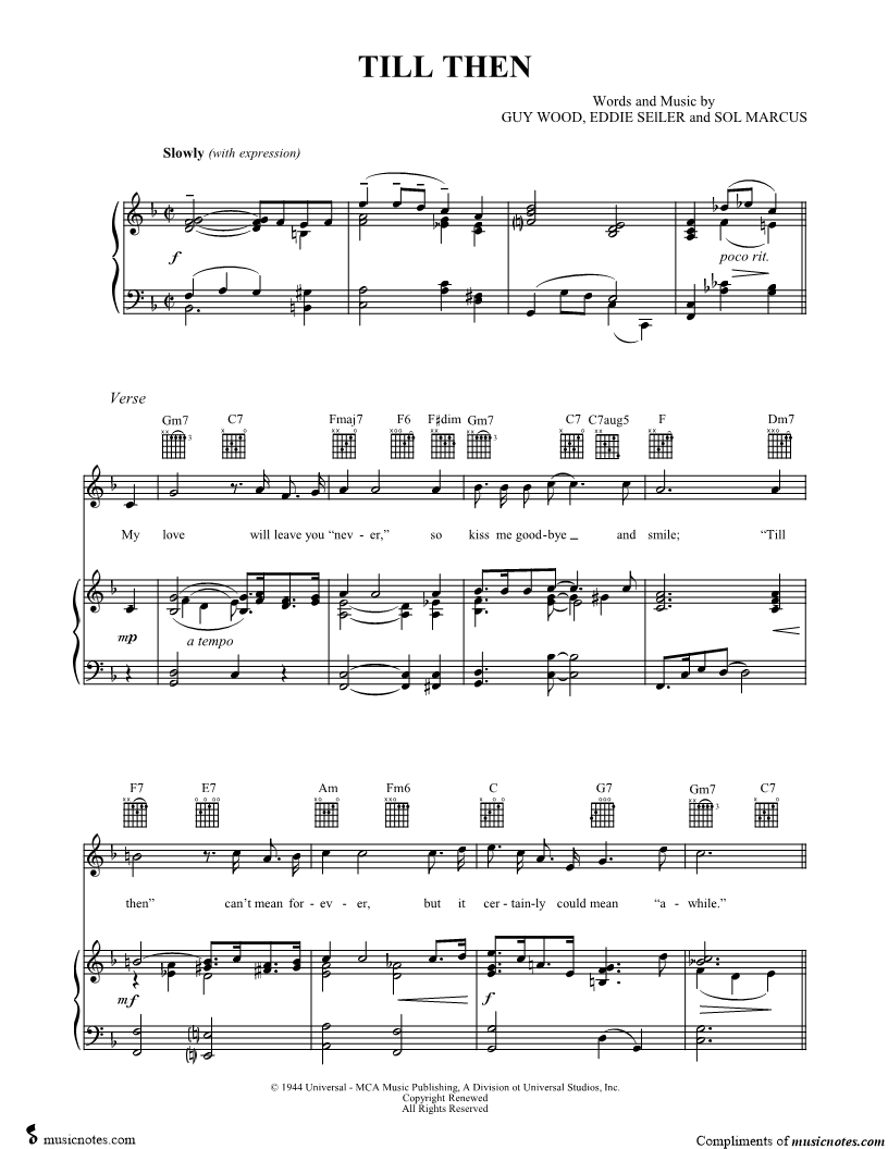 My love will leave you "never," so kiss me goodbye and smile; ``Till then'' can't mean for ever, but it certainly could mean ``awhile!" |